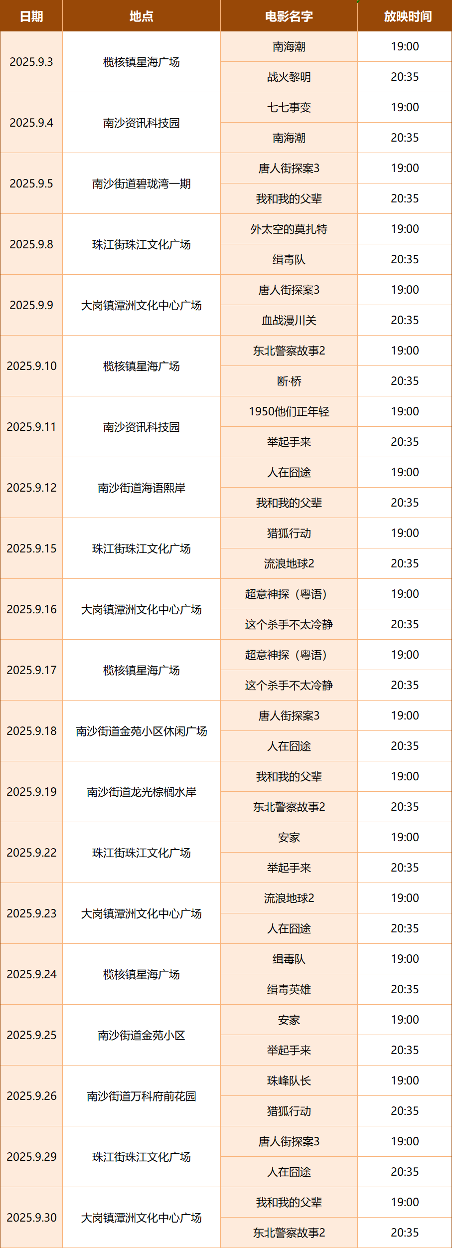 南沙街道9月数字电影放映安排表