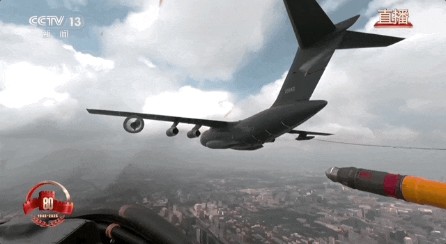 阅兵现场,为战鹰助力,为胜利续航,加受油机梯队飞临天安门上空,三架运油-20A时刻准备为轰-6N、歼-16、歼-20飞机加油。