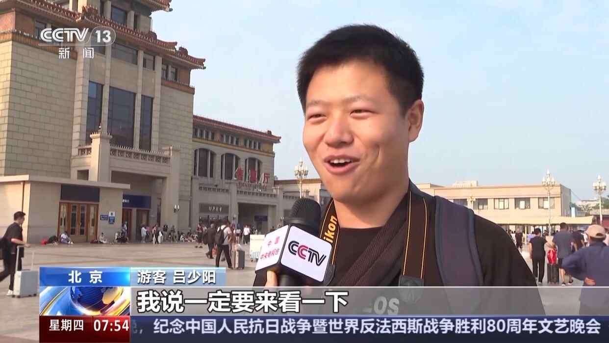 游客 楚召瀚:第一次能够有机会在现场看到飞机从天坛上面飞过去,当悬挂着党旗和国旗的飞机从祈年殿的上空划过的那一刻,内心非常自豪,也非常激动。