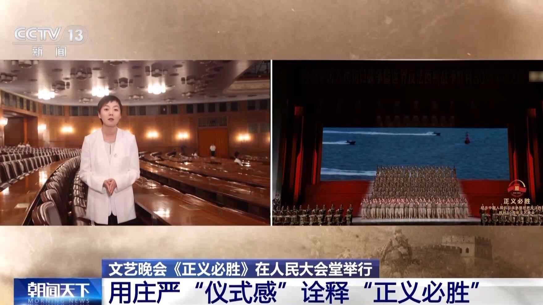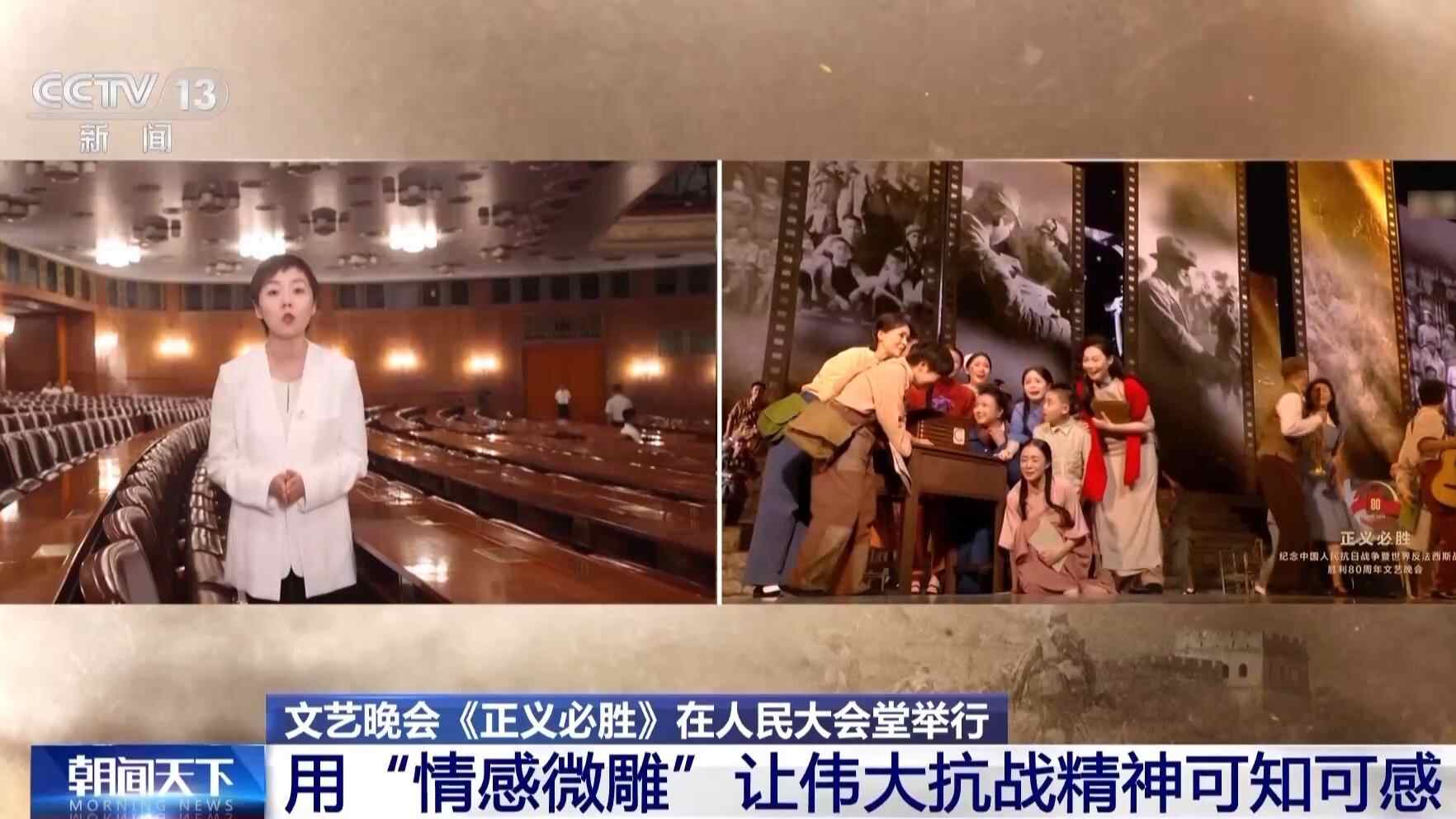 3日晚,纪念中国人民抗日战争暨世界反法西斯战争胜利80周年文艺晚会《正义必胜》在人民大会堂举行。