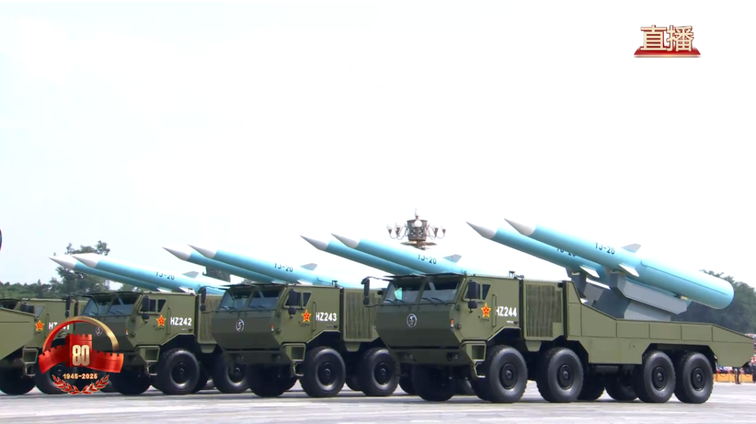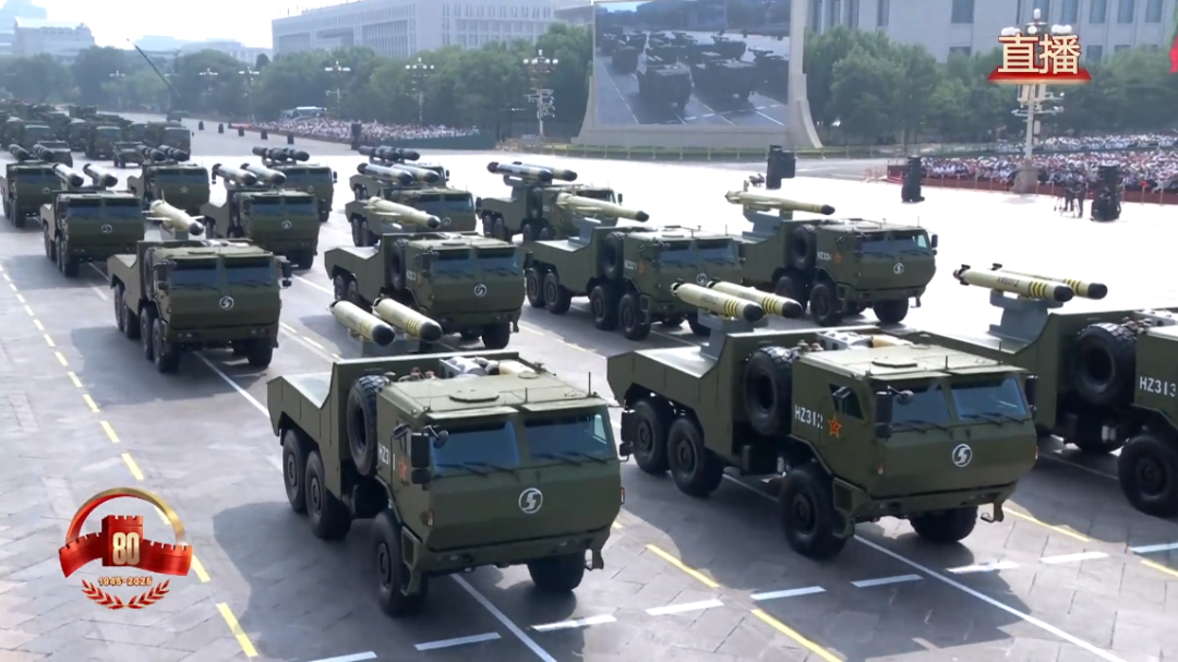 反舰导弹方队由鹰击-15导弹和鹰击-19、鹰击-17、鹰击-20高超声速导弹编成,可部署在舰载机、水面舰艇潜艇等多种平台,射程远、速度快、毁伤强,是打击海上之敌的“尖兵利器”。