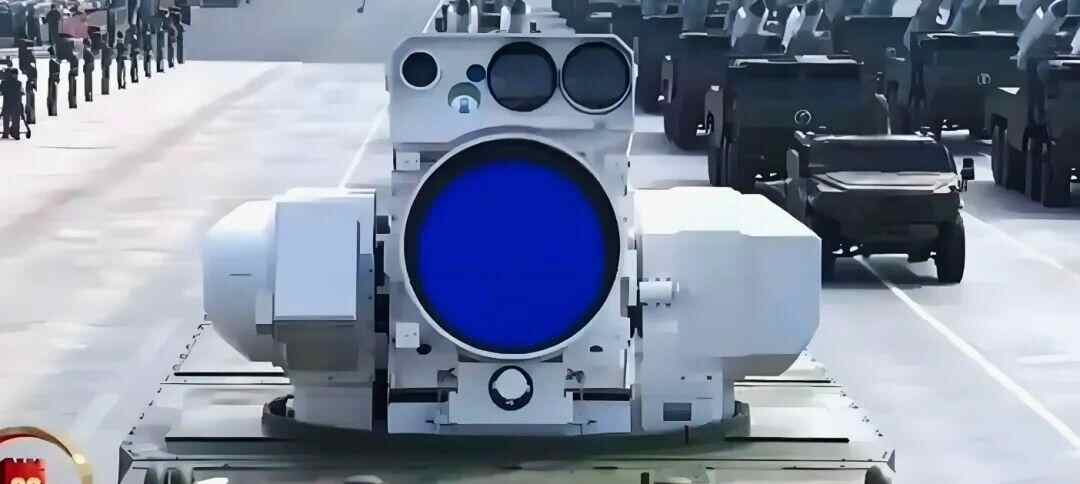 阅兵中,多台LY-1舰载激光武器(一种大型白色装置,配有深蓝色屏幕)由加长军用车辆搭载亮相。
