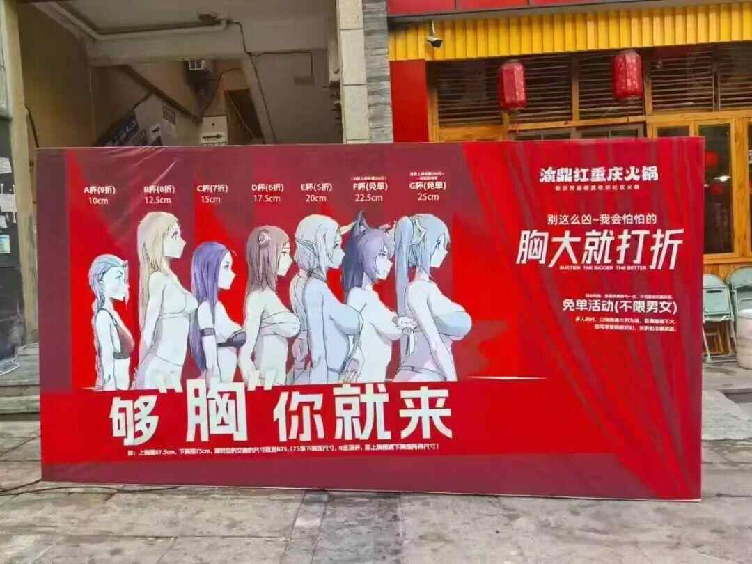 其门口广告牌公然打出“胸大就打折”“够胸你就来”的标语,还按照“A-G杯”划分折扣,从9折到免单不等,旁边配有7个身材各异的动漫人物形象。