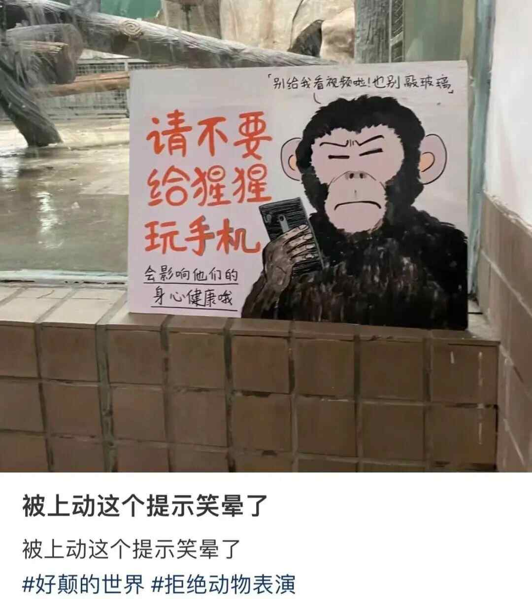 今年3月,也有网友在社交网络上分享其在动物园看到的温馨提示,上面注明:请不要给猩猩玩手机。