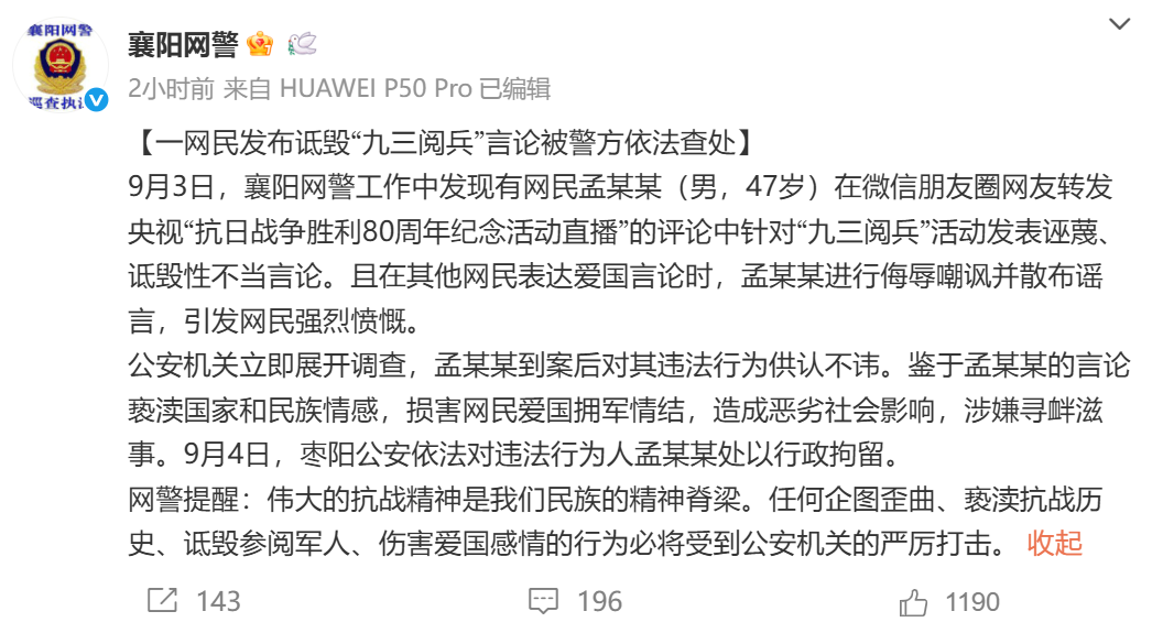 9月3日,襄阳网警工作中发现有网民孟某某(男,47岁)在微信朋友圈网友转发央视“抗日战争胜利80周年纪念活动直播”的评论中针对“九三阅兵”活动发表诬蔑、诋毁性不当言论。且在其他网民表达爱国言论时,孟某某进行侮辱嘲讽并散布谣言,引发网民强烈愤慨。