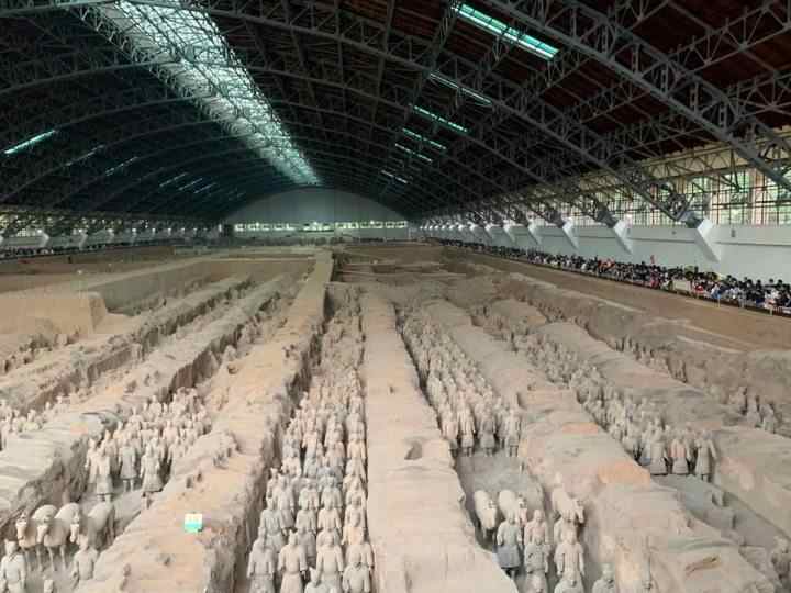 资料显示:一号坑是秦俑三坑中最大的一个。