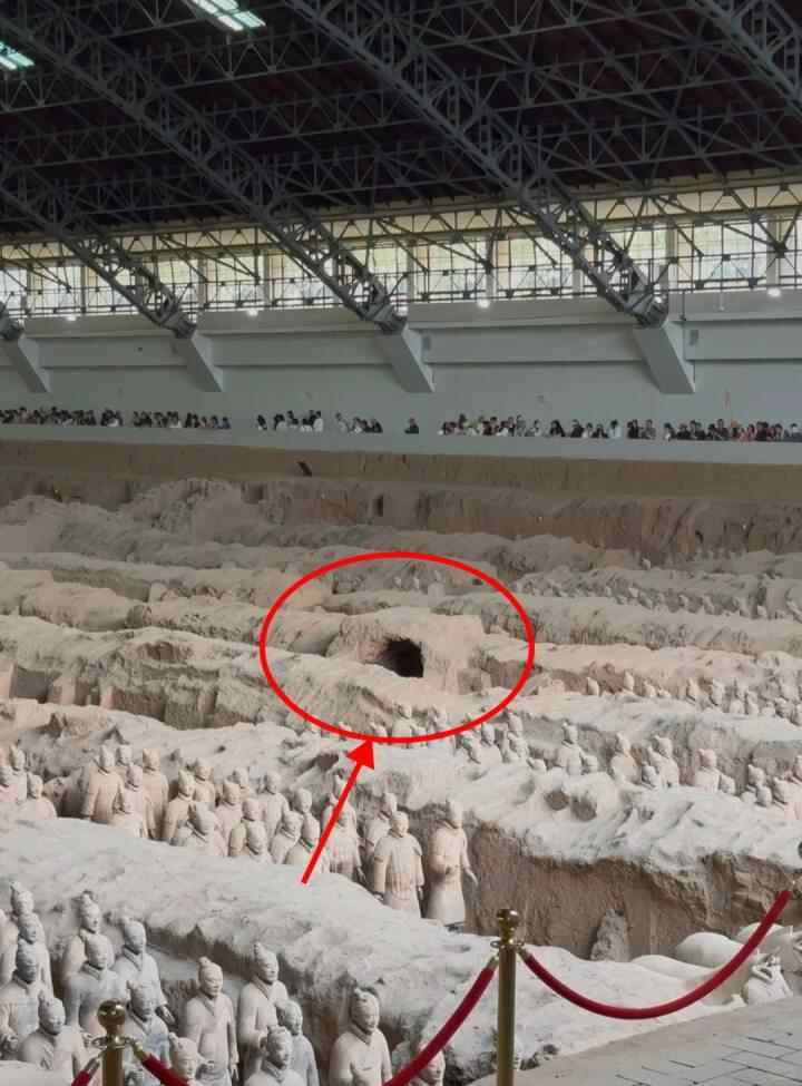 当年兵马俑的修建是尽量隐蔽的,知道的人不多,后面朝代就有普通人也把墓选在了这里,留下了这个大洞。