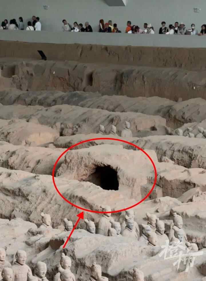 近日,有网友参观秦始皇帝陵博物院,惊奇地发现:兵马俑一号坑有个洞,位于坑内中部,直径1米左右,由顶部直达,打破了部分隔墙。
