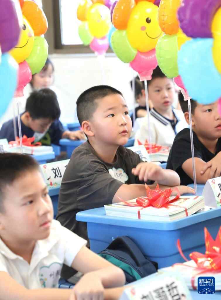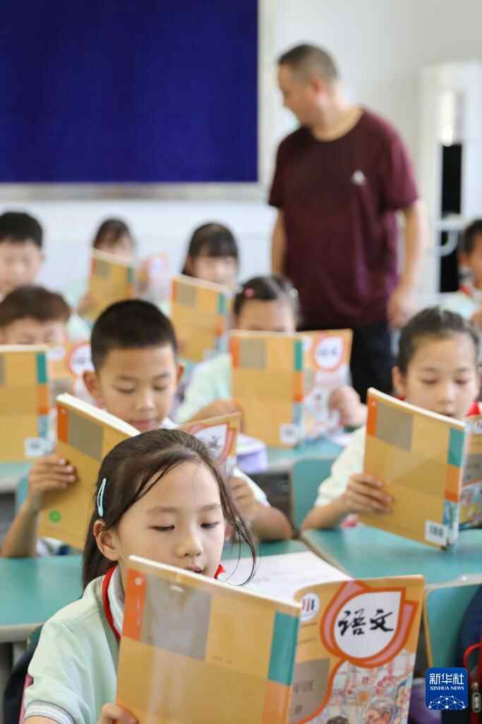 8月30日,在浙江省嘉兴市三水湾小学,学生们在教室翻看领到的新课本。