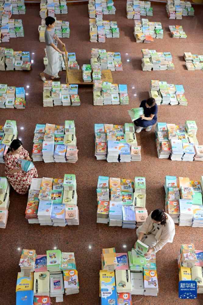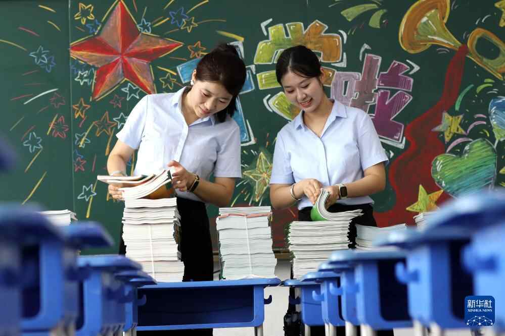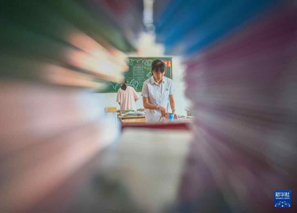 8月29日,在湖南省永州市道县道州玉潭(东阳)学校,老师在教室内摆放课本。