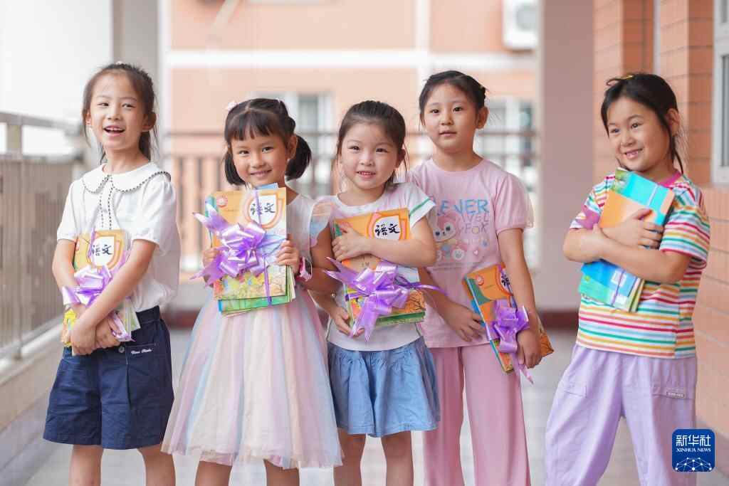 8月30日,重庆市北碚区朝阳小学一年级新生抱着新书在校园玩耍。