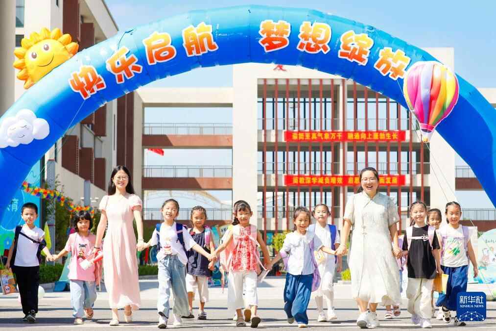 8月30日,在江苏省海安市南屏小学,一年级新生和老师一起走在校园里。