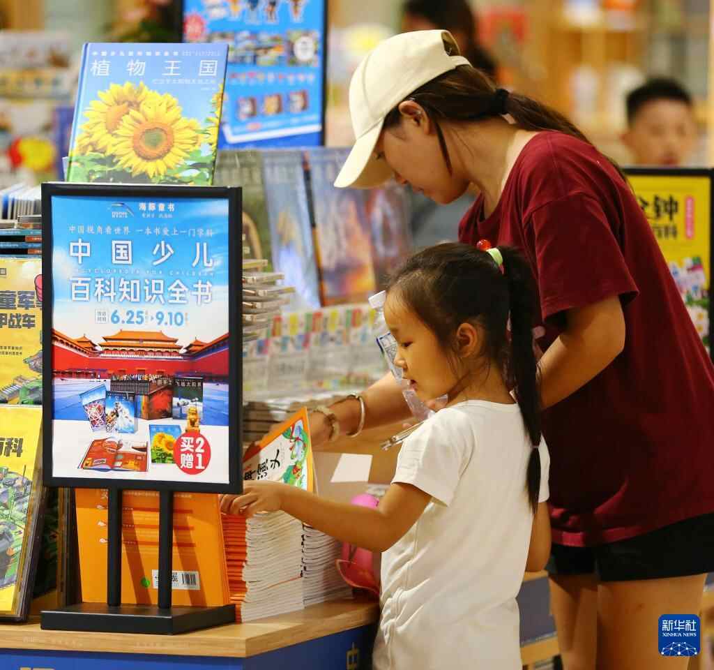 8月30日,在山东滕州书城,家长带着孩子选购学习辅助书籍。
