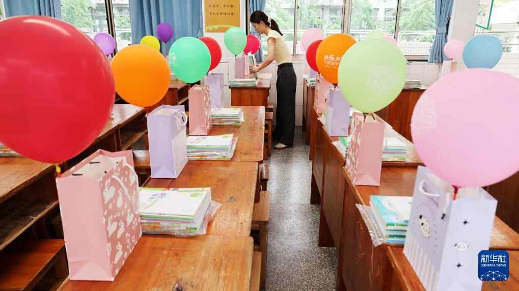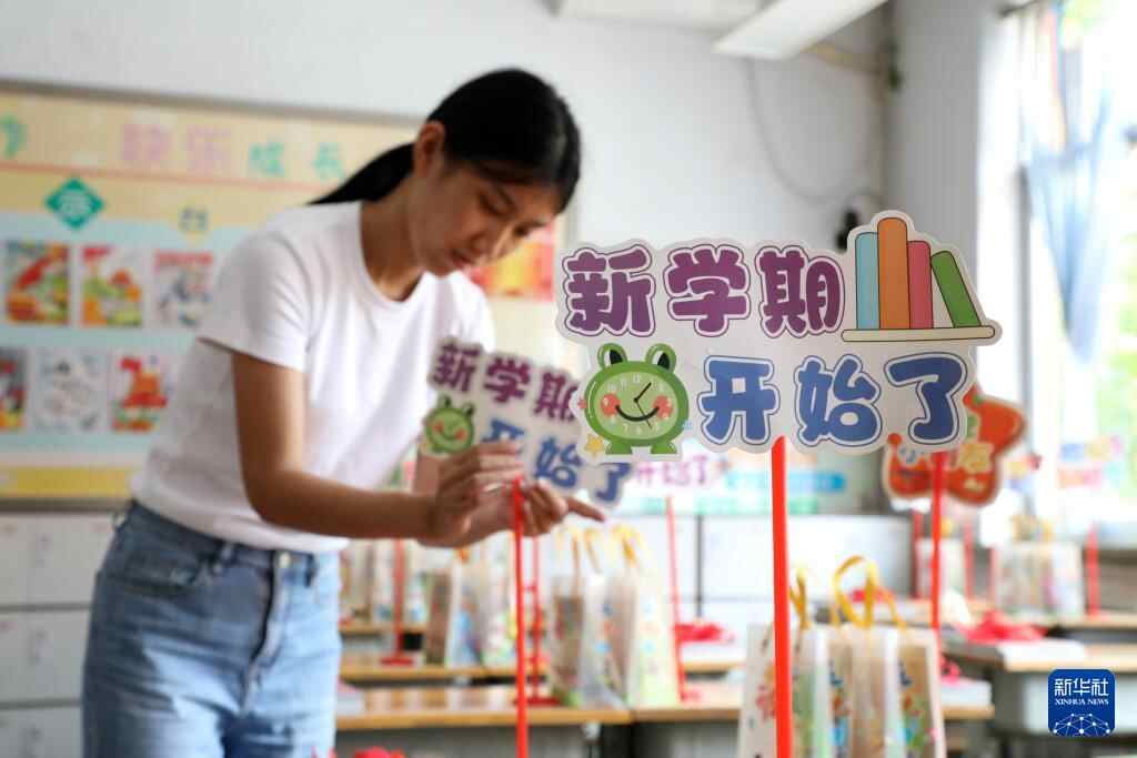 8月30日,在山东省滨州市博兴县第一小学,老师在布置教室迎接开学。