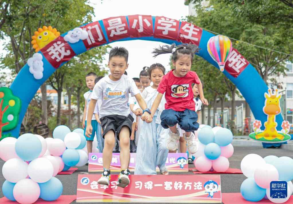 8月30日,在山东省荣成市府新小学,小学生们跨越“成长跨栏”,步入新学期。