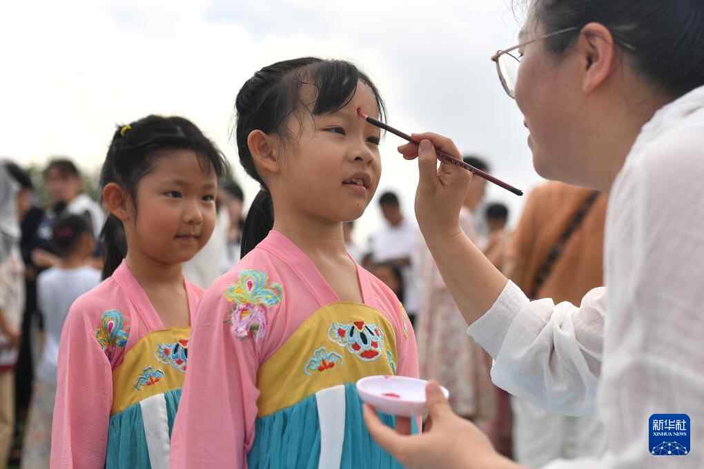 8月30日,在山东省青岛市城阳区夏庄街道古镇小学开学日活动上,老师为小朋友点朱砂。