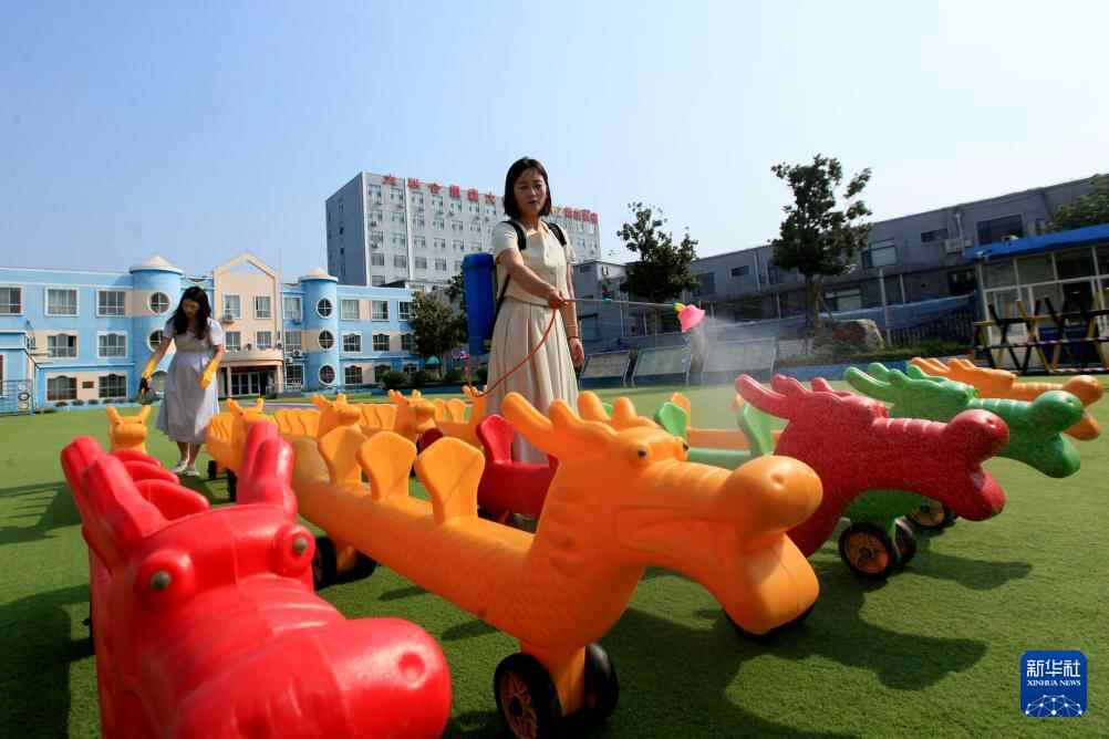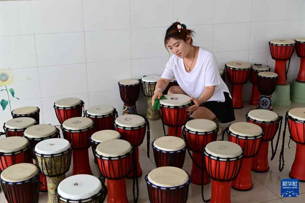 8月28日,在河南省沁阳市第一幼儿教育集团白庄村幼儿园,老师在擦拭非洲鼓。