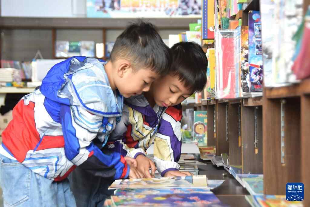 8月30日,一对双胞胎在云南省蒙自市新华书店选购书本。