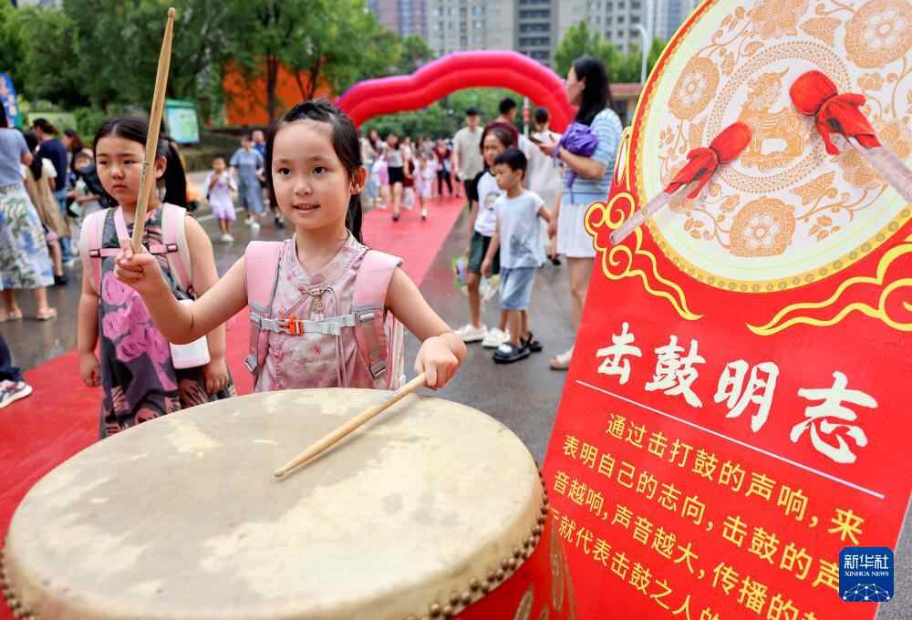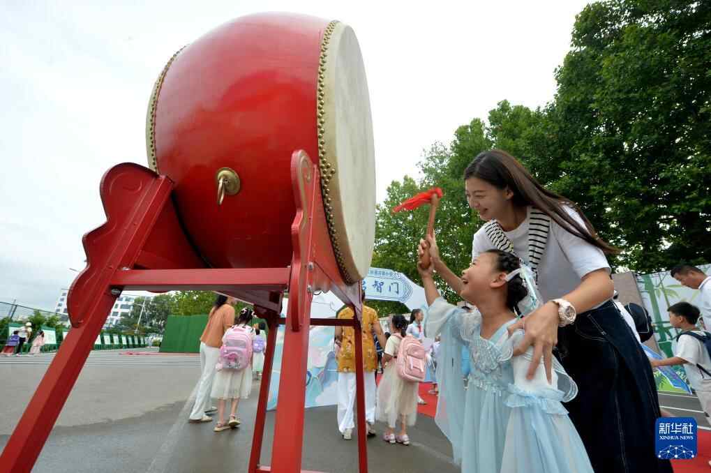 8月30日,在山东省青岛市城阳区夏庄街道古镇小学开学日活动上,小朋友在家长陪伴下“击鼓明志”。