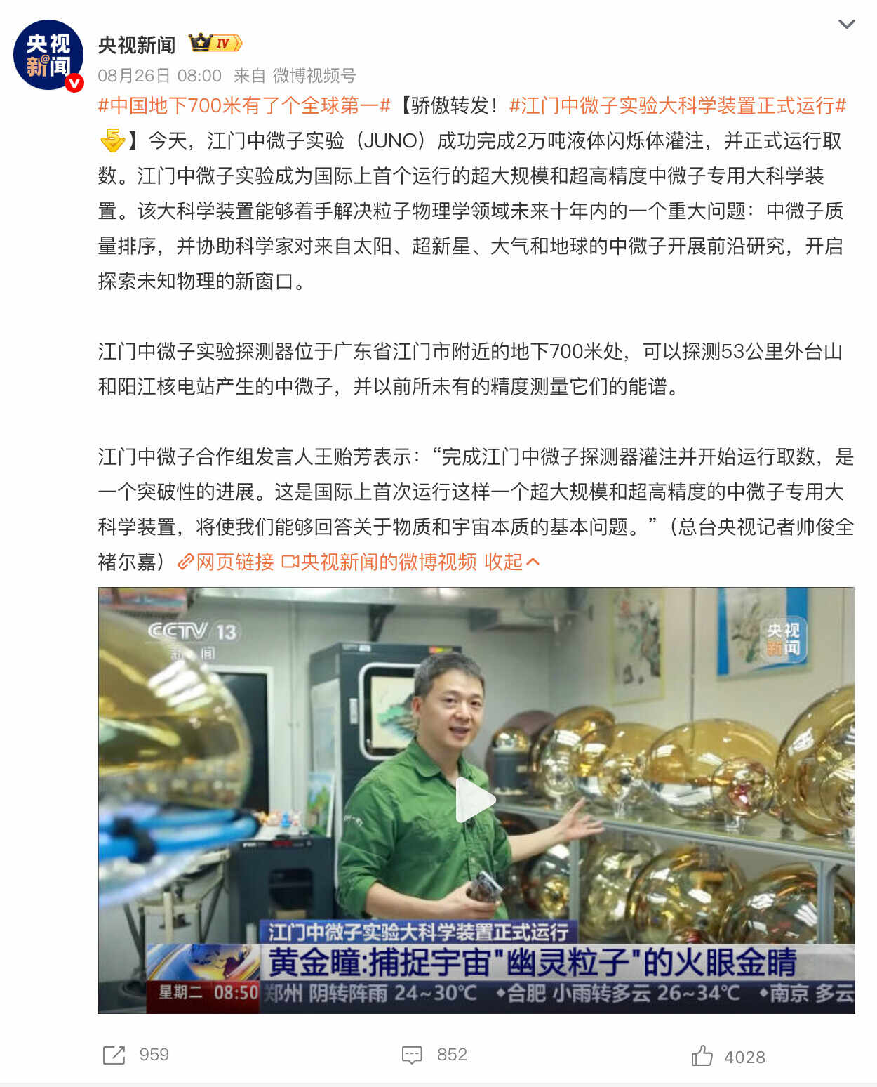 由中国科学院和广东省共同建设的江门中微子实验(JUNO),在广东省江门开平市成功完成2万吨液体闪烁体灌注并于8月26日正式运行取数。经过十余年的准备和建设,JUNO成为国际上首个建成的下一代大型中微子实验装置。这个用来捕捉有“幽灵粒子”之称的中微子的大科学装置,是国际上首次运行此类超大规模和超高精度的中微子专用大科学装置,使科学家能够回答关于物质和宇宙本质的基本问题。
