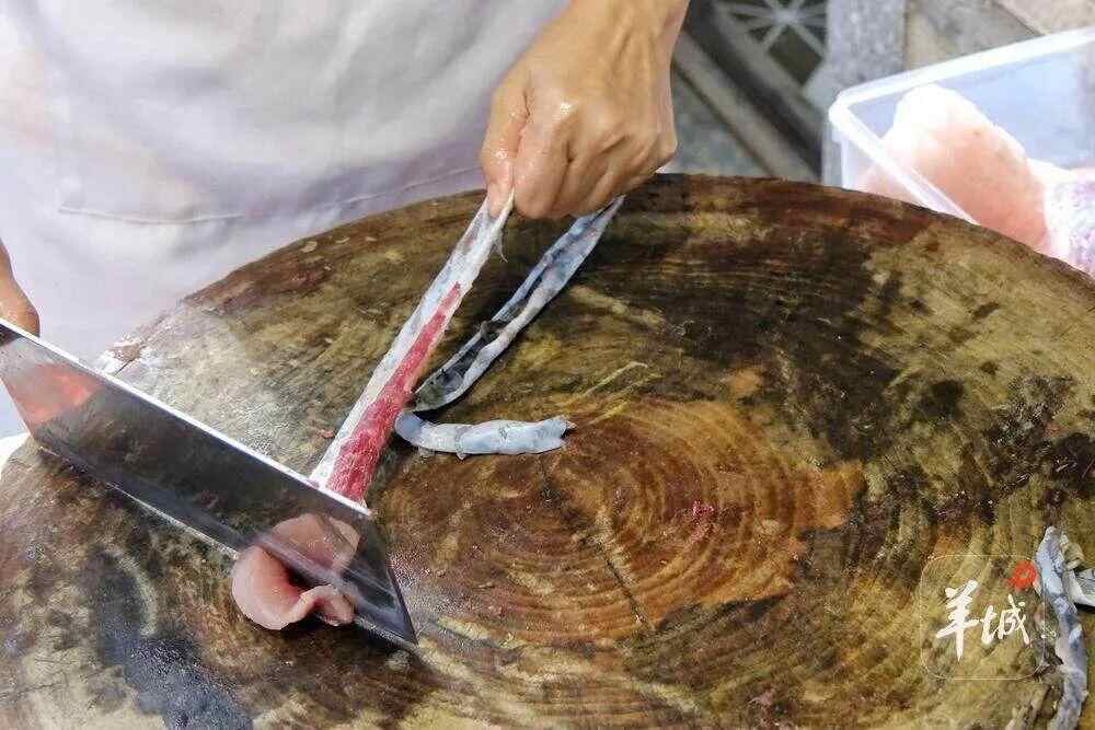 “起鱼皮”讲究手艺,刀切鱼肉但不断皮,用大拇指缓缓分离鱼肉和皮,最后再用刀轻轻刮掉粘在鱼皮上的鱼肉、鱼筋。鱼皮要用开水烫熟,时间把握全凭师傅手感。烫熟再“过冷河”(过一遍冷清水),然后放冰柜冰冻。