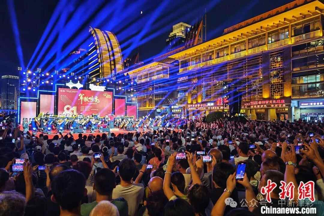 8月1日,天津海河畔,民众欣赏音乐会。当晚,“海河之夜”桥边音乐汇之军歌嘹亮“八一”建军节交响音乐会在古文化街亲水平台奏响。来自天津交响乐团的艺术家们为现场观众带来经典军旅歌曲,向中国军人致敬。中新社记者 佟郁 摄