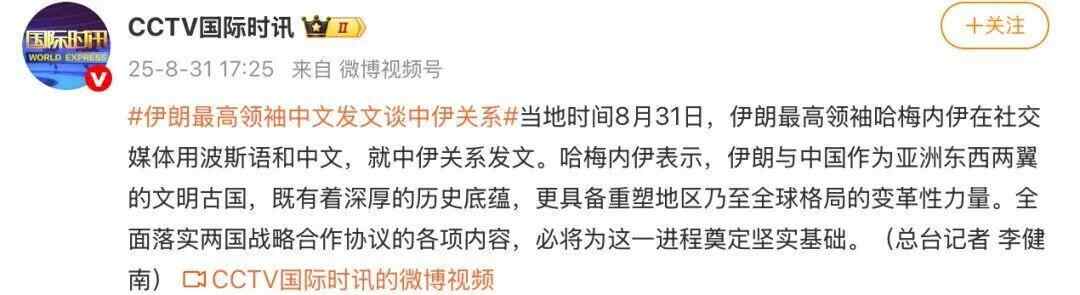 当地时间8月31日,伊朗最高领袖哈梅内伊在社交媒体用波斯语和中文,就中伊关系发文。