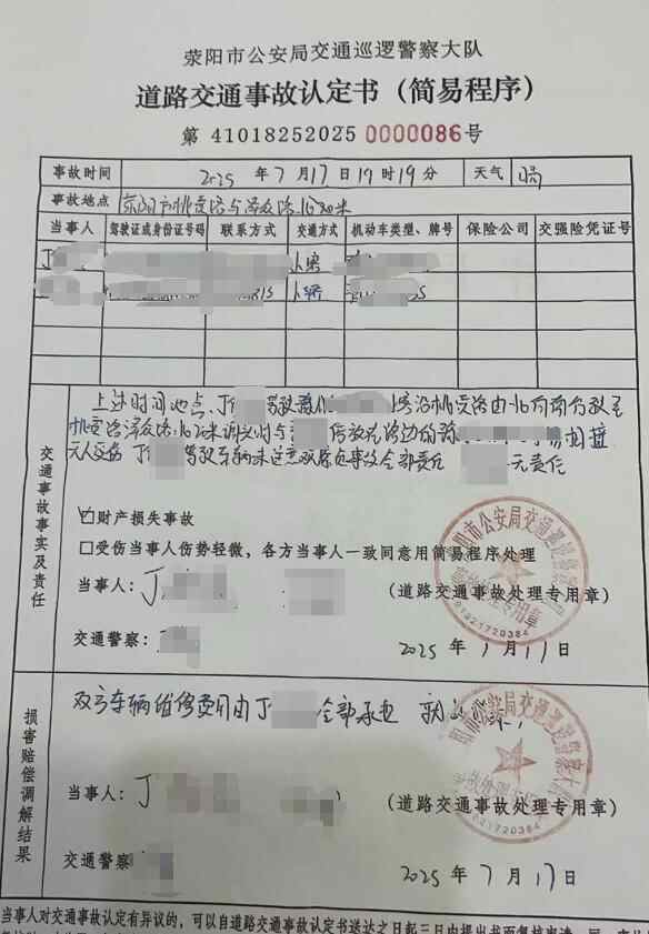 交警出具的《交通事故责任认定书》显示,这起财产损失事故中,“丁女士驾驶车辆未注意观察负事故全部责任”。