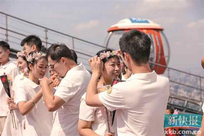 “最好的风景在眼前,最爱的人在身边。”8月29日是“七夕”佳节,在450米的广州塔城市之巅,15对新婚夫妇身着运动风婚服举行集体婚礼,许下一生一世的诺言。