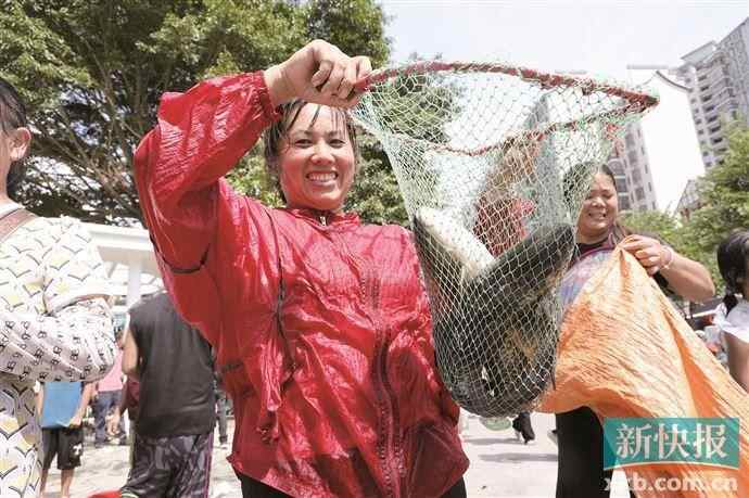 14时,随着数千斤的鲜活草鱼被投入河中,游客们卷起裤脚下河捉鱼。来自清远连南的唐大哥在放鱼的瞬间就第一时间下水,如愿捕获了一条约三斤重的草鱼。他开心地告诉新快报记者,参加七月香活动两三年了,今天捉到鱼,晚上准备做一道酸菜鱼吃。新快报记者看到,很多早早到场的街坊和游客都捉到了鱼。