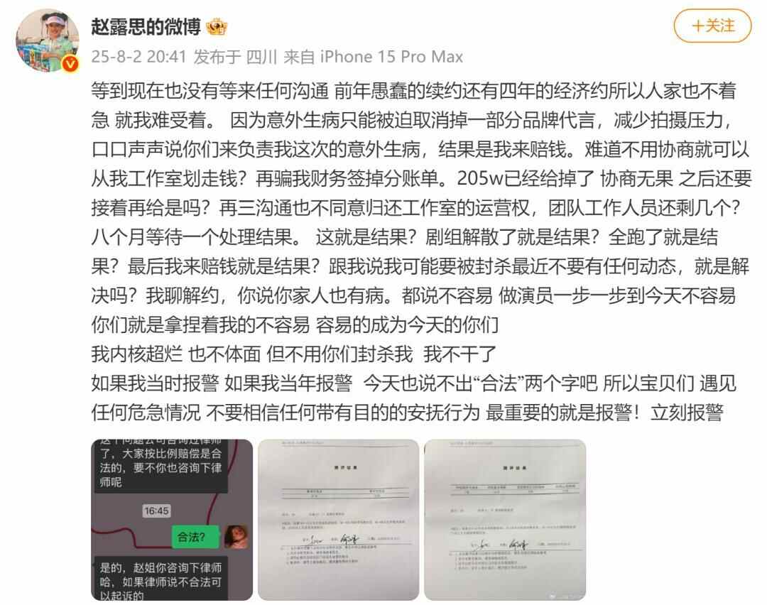8月2日,赵露思发长文控诉经纪公司银河酷娱传媒,称其从工作室划走205万,等到现在也没有等来任何沟通,“我内核超烂,也不体面,但不用你们封杀我 ,我不干了。”