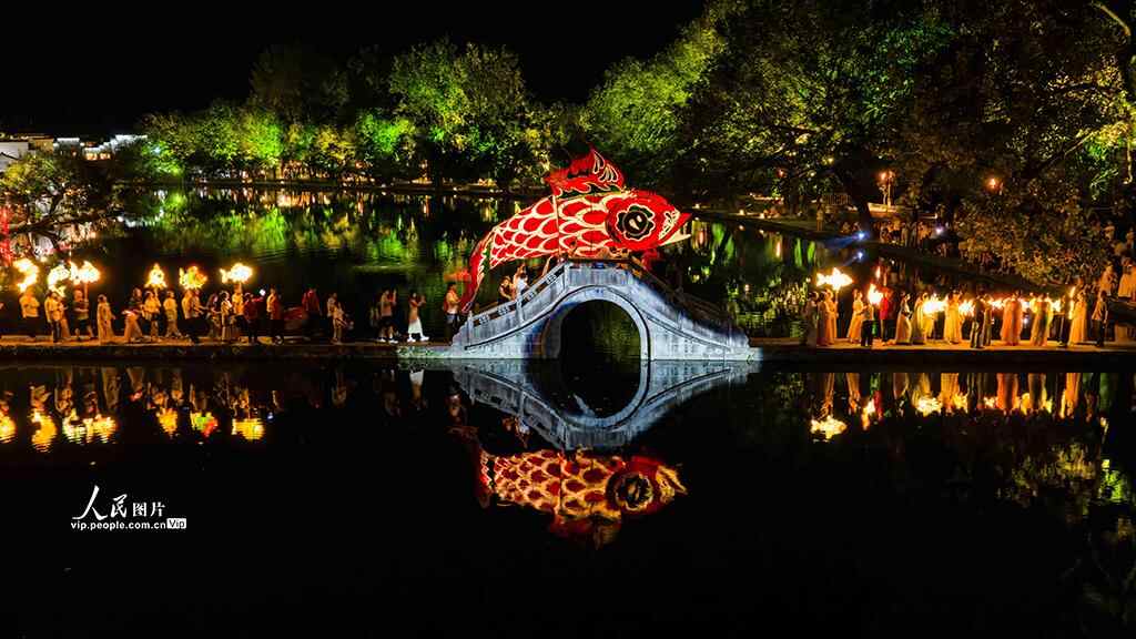 2025年8月29日晚,安徽省黄山市黟县宏村景区上演非遗鱼灯表演,吸引众多游客驻足观看。储成胜摄(人民图片网)