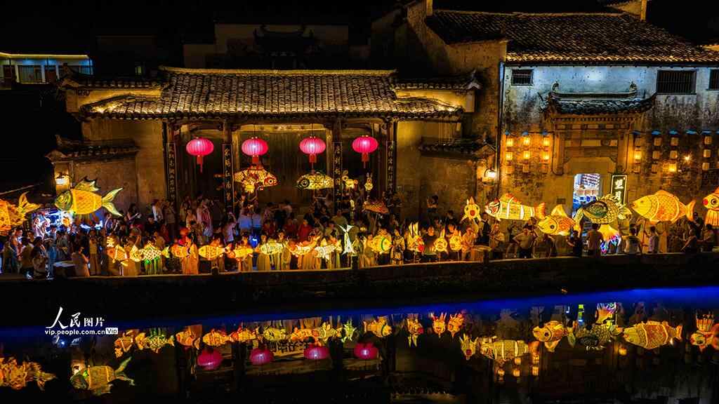 2025年8月29日晚,安徽省黄山市黟县宏村景区上演非遗鱼灯表演,吸引众多游客驻足观看。储成胜摄(人民图片网)