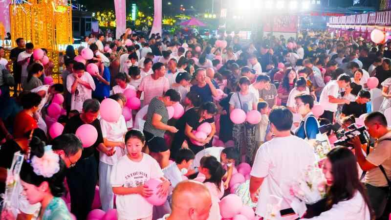 8月1日晚,新余最繁华的恒太城广场华灯璀璨,2000只粉色气球如瀑布般倾泻而下,在市民如潮的欢呼声中,“为爱甄选”活动率先引爆现场气氛。节庆的欢腾转化为消费的热力。市民和游客在“踩气球寻宝”的游戏中收获惊喜——奖品包含仙女湖景区门票、文创礼品、民宿折扣券等“宝藏礼券”。“我今天抢到3张券。”市民钱小小兴奋地展示着自己的收获。