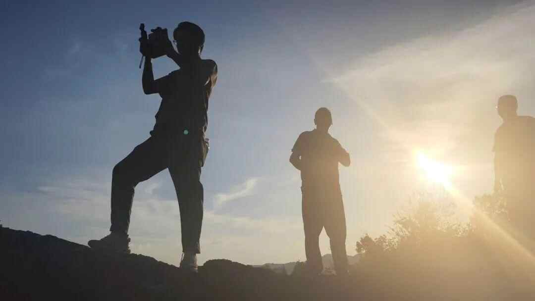我们是下午从刘国玉先生惜斋出来后到的这里。停车,沿泥路一直往山上走,路越走越难,披荒榛,拂荆棘,驱蛇蚁,惊秋蝉,终于登顶,来到一处高地,豁然开朗,群山万壑,暑气蒸腾。陈德道说,这就是要带你们来看的“高士部落”。因是从高处往下看,效果不佳,遂转他处。