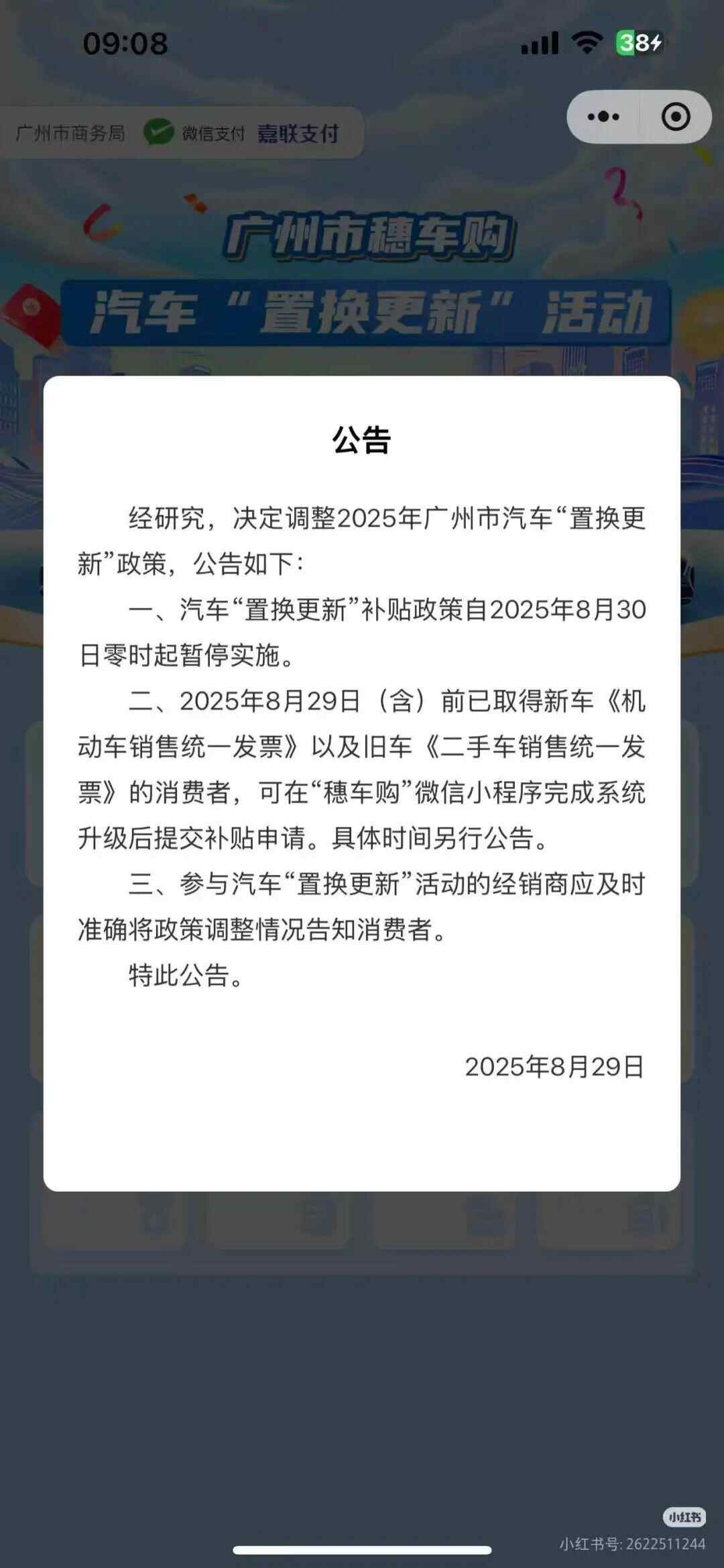 2025年8月29日(含)前已取得新车《机动车销售统一发票》以及旧车《二手车销售统一发票》的消费者,可在“穗车购”微信小程序完成系统升级后提交补贴申请。具体时间另行公告。