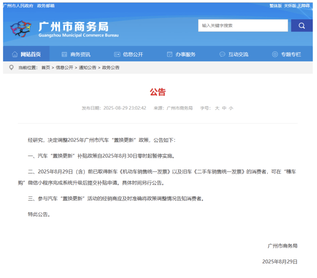 根据公告内容,广州汽车“置换更新”补贴政策自2025年8月30日零时起暂停实施。