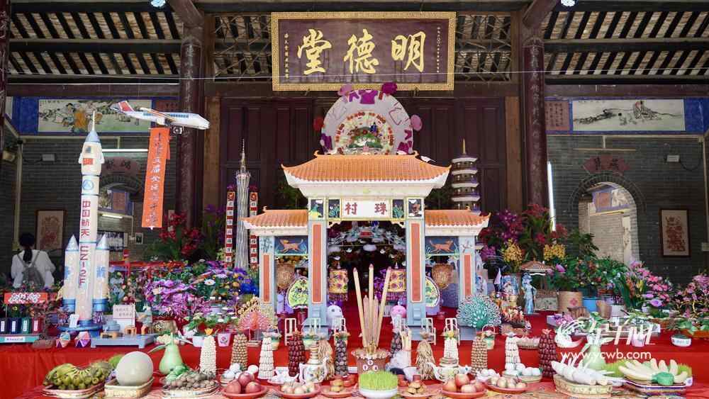 潘氏祠堂的“摆七娘”,展示了“巧娘”们制作的种类繁多、争奇斗艳的手工艺品,有用五谷杂粮粘砌而成的斋塔,有用木工框架搭建的鹊桥景观,还有全运会、载人飞船、地铁站等现代元素创作。潘剑明指着案头地铁站的模型,高兴地告诉记者,即将开通的广州地铁13号线二期珠村站,现已成为乞巧文化主题站,将极有利于传扬乞巧文化。