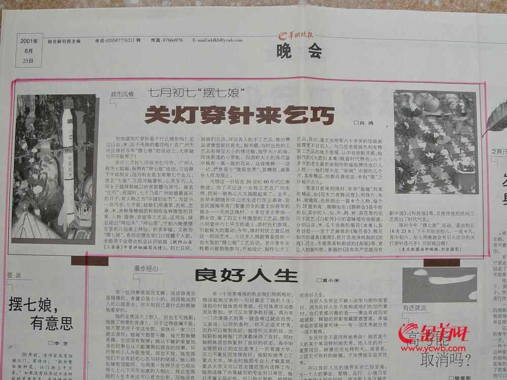 “不过,进行到第三年,已经有人开始说我们是封建迷信死灰复燃。”2001年,潘剑明在东圃镇任干部,他考虑到,如果不为乞巧正名,那人们永远都是背着一个包袱在搞。于是,他亲手查资料,写通稿文章,找来了媒体、民俗专家,大力宣扬乞巧这一良风美俗。