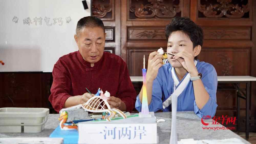 广州乞巧文化博物馆里,在潘剑明的指导下,13岁的初中生黄奕铮正在为自己的乞巧作品进行最后的上色、拼装,作品中,他创新运用3D打印技术,将海心桥、广州塔、牛郎织女、十五运吉祥物、龙舟等元素巧妙组合,构成一幅生动的珠江江景图。