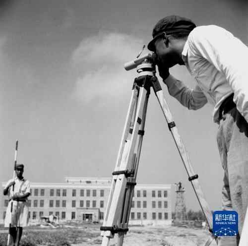1951年,工程技术人员在中国人民大学建设工地测量。丁一 摄