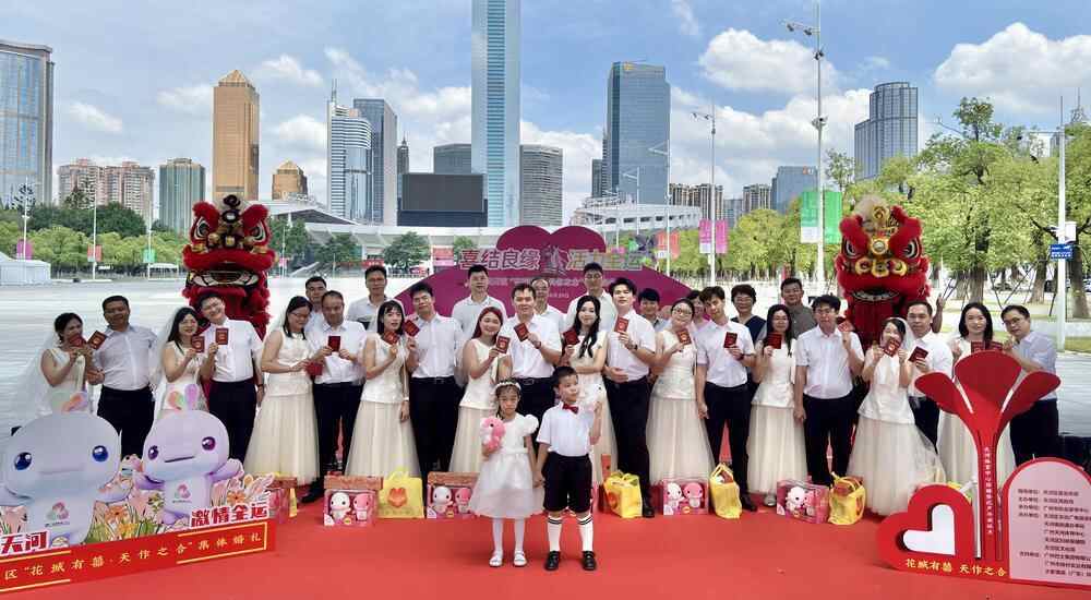 8月29日正值七夕,一场集体婚礼活动在广州天河体育中心南广场举行,10对新人参加集体颁证和婚礼活动。