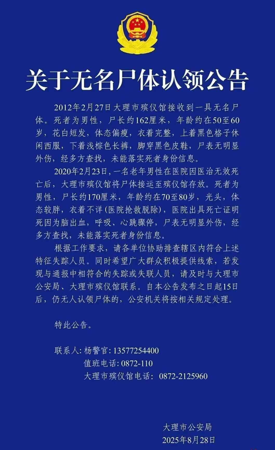 8月28日,云南大理市公安局发布一条关于无名尸体认领公告。