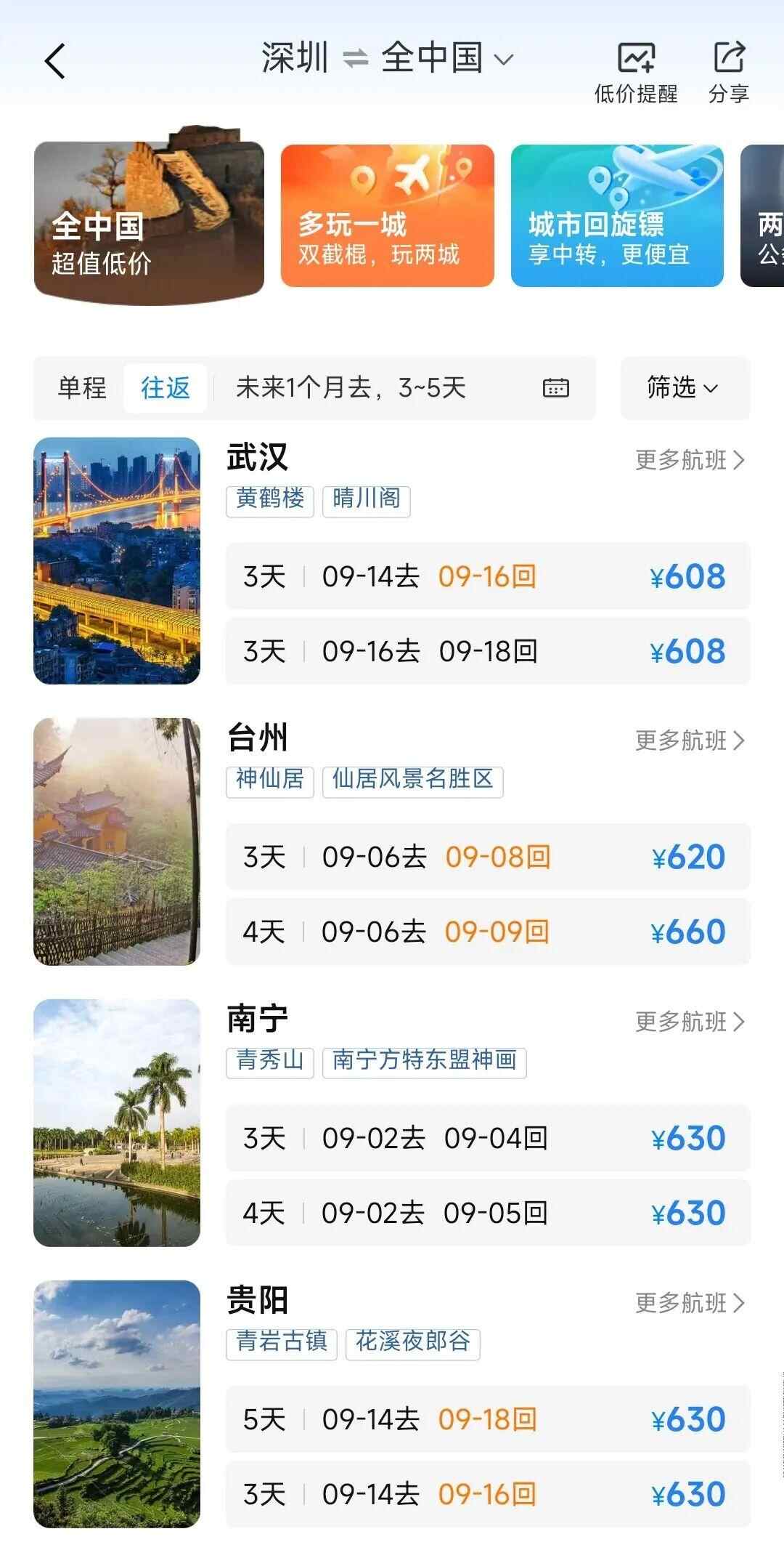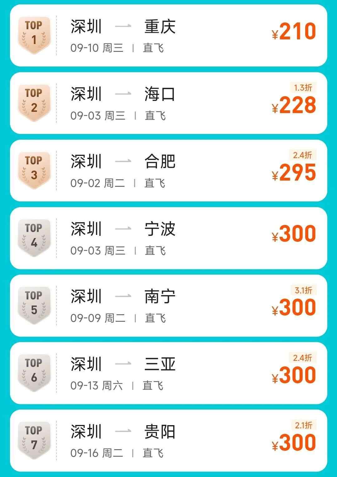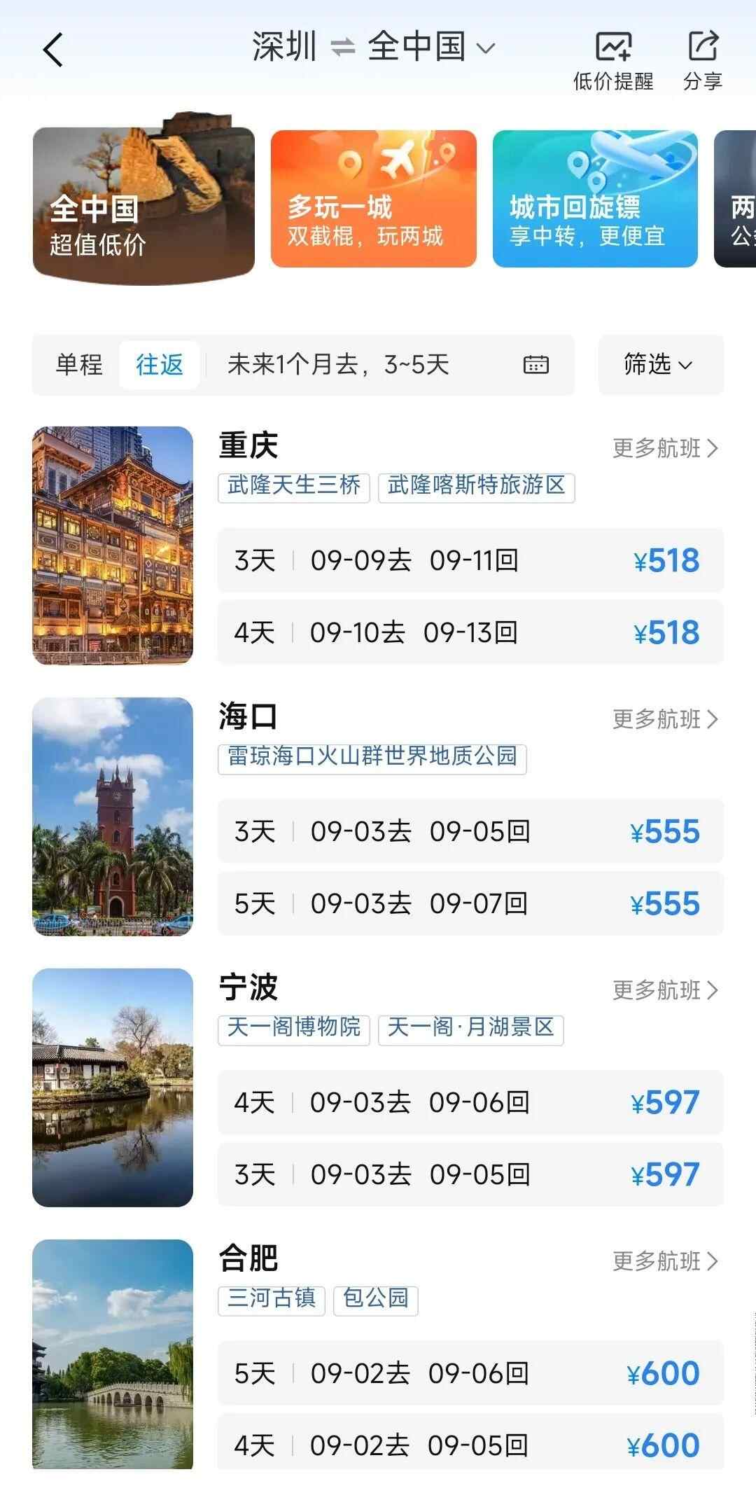 国内航线方面,与7月动辄千元以上的机票相比,9月不少航线价格“打骨折”,低廉的价格适合预算有限的错峰旅游人士。