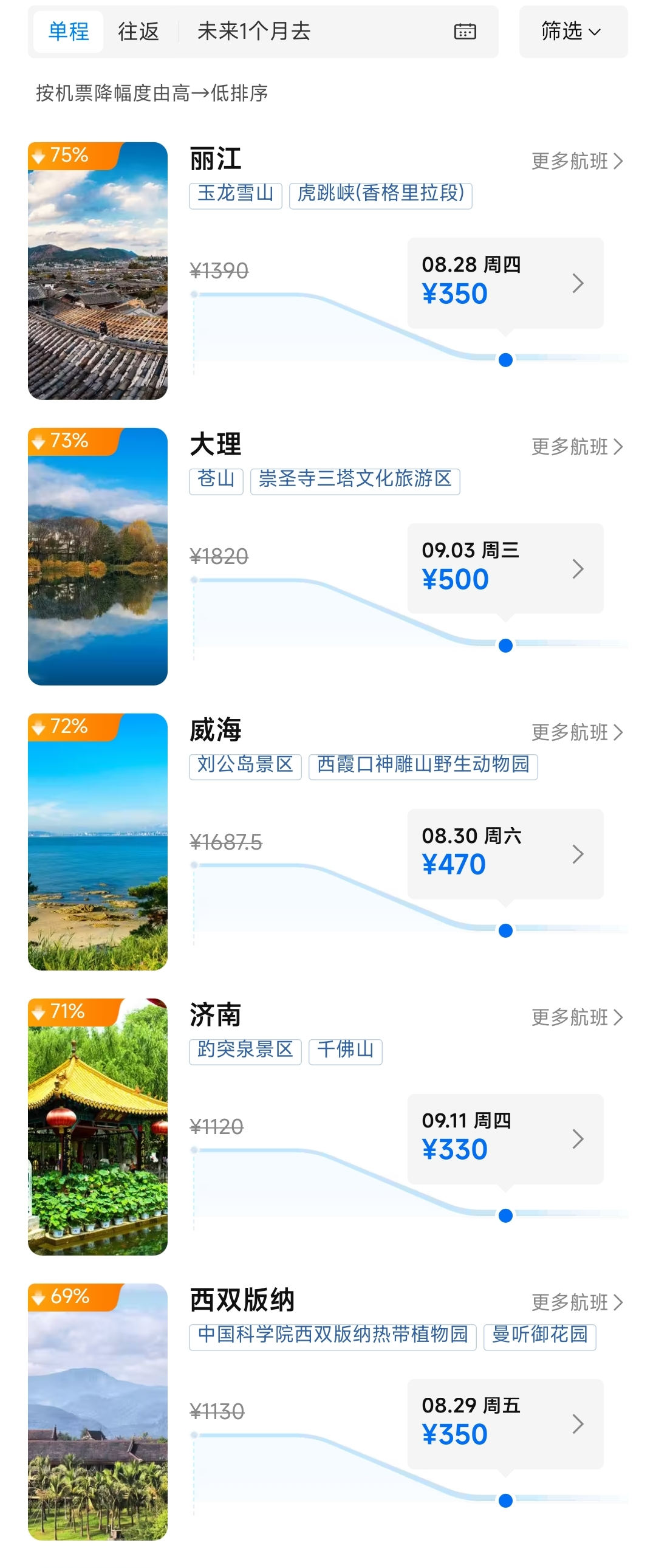 随着暑假的即将结束、各大中小学开学,出游人数减少,市场供大于求,机票价格会逐步下调。相关数据显示,与旅游高峰时段相比,错峰旅行可以节省大约30%的出行成本。