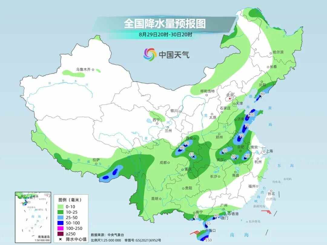 随着副热带高压减弱南退,北方冷空气南下,周末两天降雨将明显向南发展。其中,降雨较强的地方主要集中在山东中东部、安徽北部、江苏中北部、湖北东部、辽宁东部、吉林东部等地,部分地区有大到暴雨,局地或现大暴雨,并伴有短时强降水,局地有雷暴大风等强对流天气。