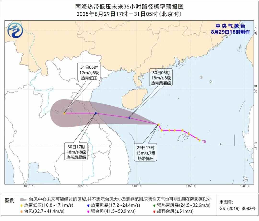 而在副热带高压南侧,受热带低压影响,华南沿海一带也将出现强风雨天气。从其预报路径来看,30日凌晨至上午,该热带系统将从海南南部近海掠过,上述地区处在危险半圆内。