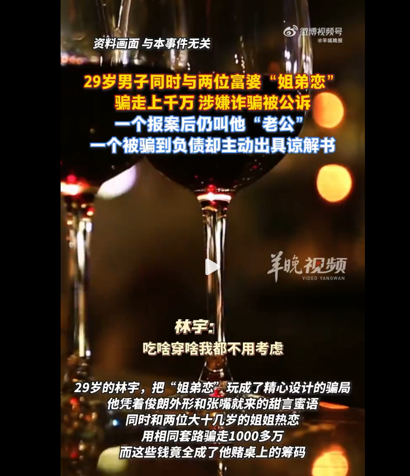 29岁林宇以“姐弟恋”为名同时诈骗两位四十余岁女性超千万元。林宇原本过的是99%的人都无法想象的生活:自己月入30万+,富婆姐姐还愿意给每月30万的生活费,送房又送车……