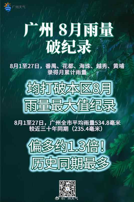 根据广州市气象部门统计,8月1日至27日,广州全市平均雨量为534.8毫米,较近三十年同期(235.4毫米)偏多约1.3倍,历史同期最多。