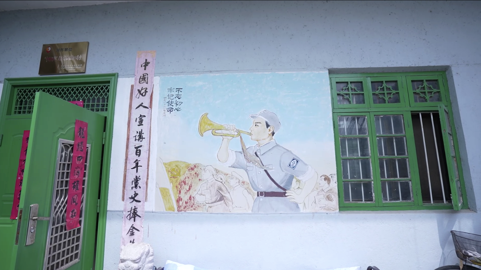 周仁甫老人家中小院的墙壁上,绘有新四军战士形象的水粉画。